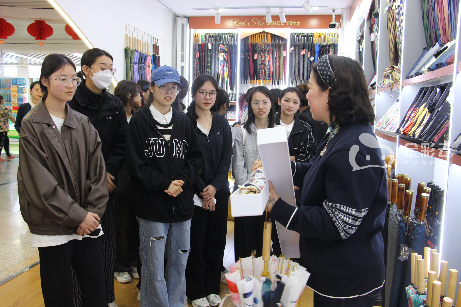 听着商贸城讲解员的解说,学生们积极与商户互动交流,感受经济脉动。在五金、雨伞、饰品等不同区域,大家相互组队寻找到了感兴趣的创业方向后,驻扎摊位,和商贸城老板们一同卖起了小商品。