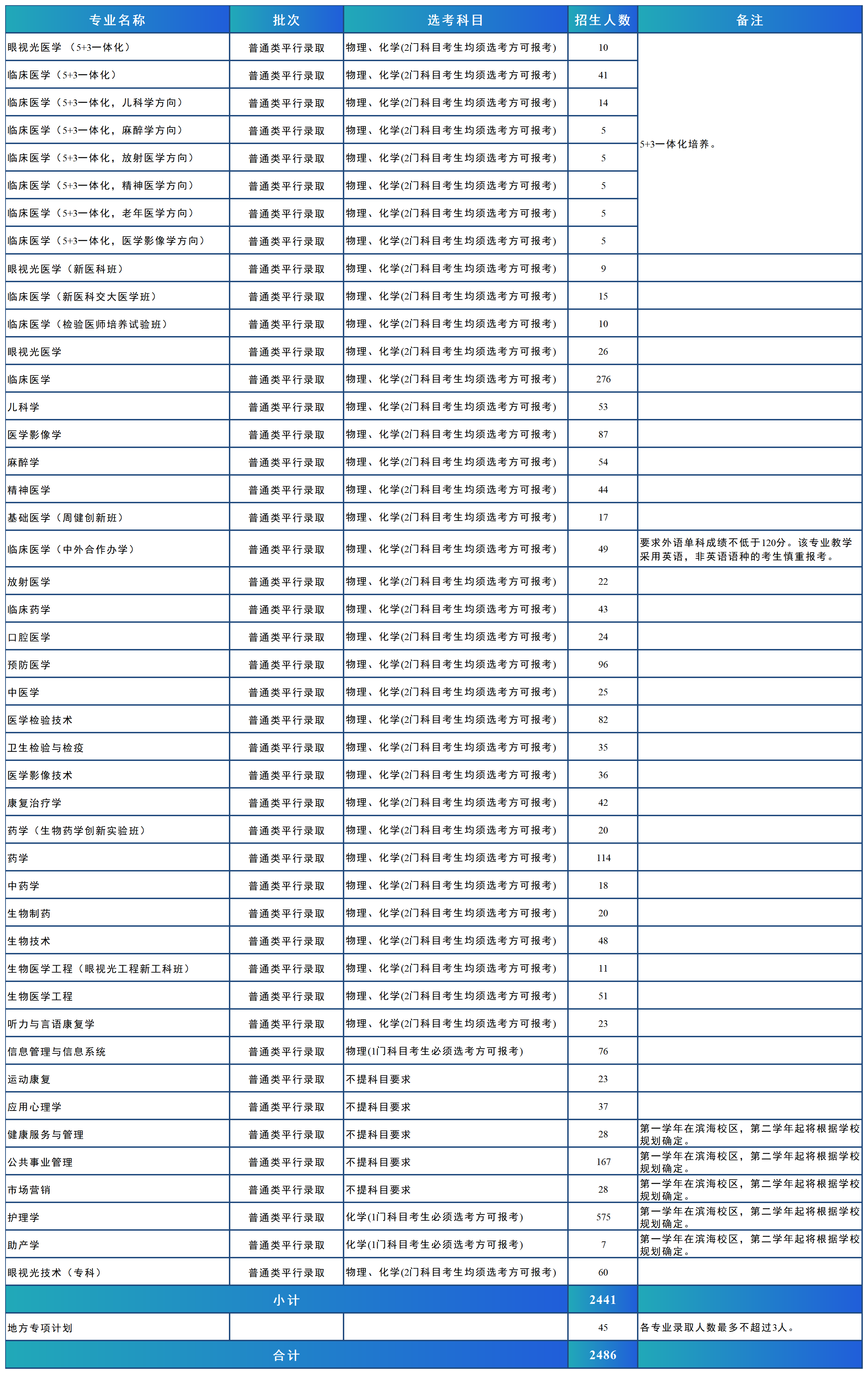温州医科大学2024年计划招生3960人,其中浙江省内2852人,包括“三位一体”综合评价招生200人,普通类提前(基层卫生人才定向培养)166人,普通类专业2441人,省内地方专项计划45人。面向浙江省以外的28个省(市、自治区)计划招生1089人。另不分省招生计划19人。