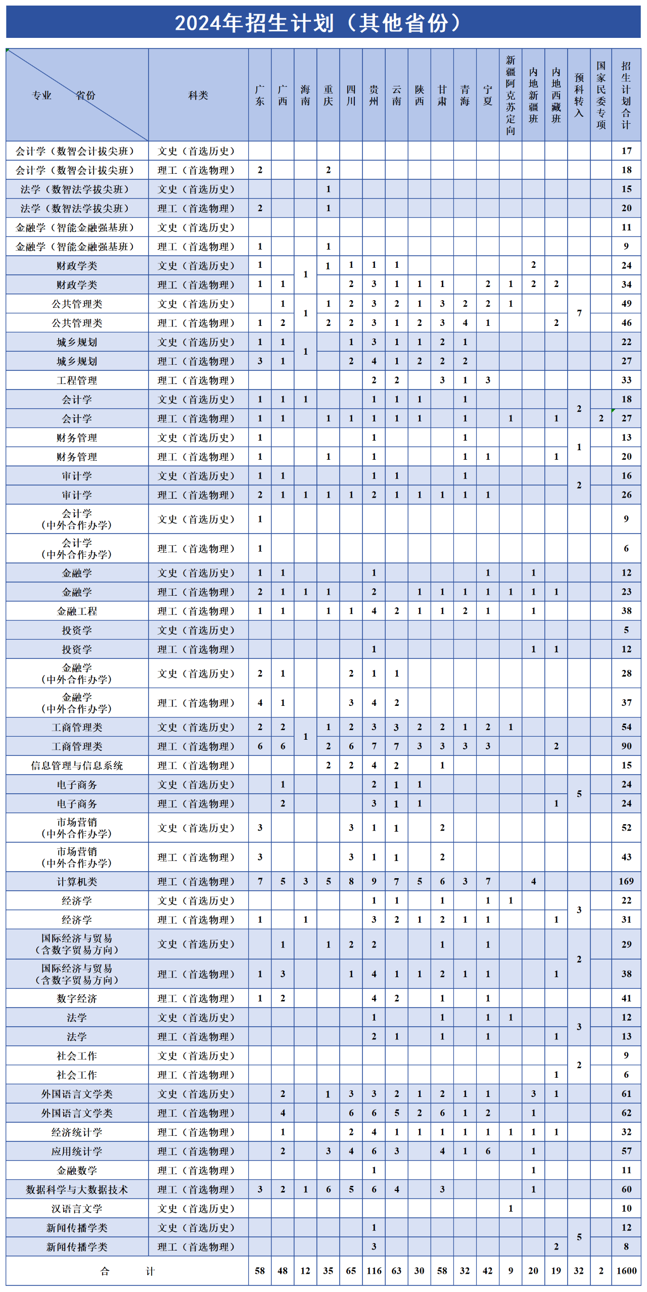 2024年浙江财经大学面向全国招生,普通类招生计划4500人,其中面向浙江省招生2900人(含三位一体和地方专项计划),外省计划1600人。