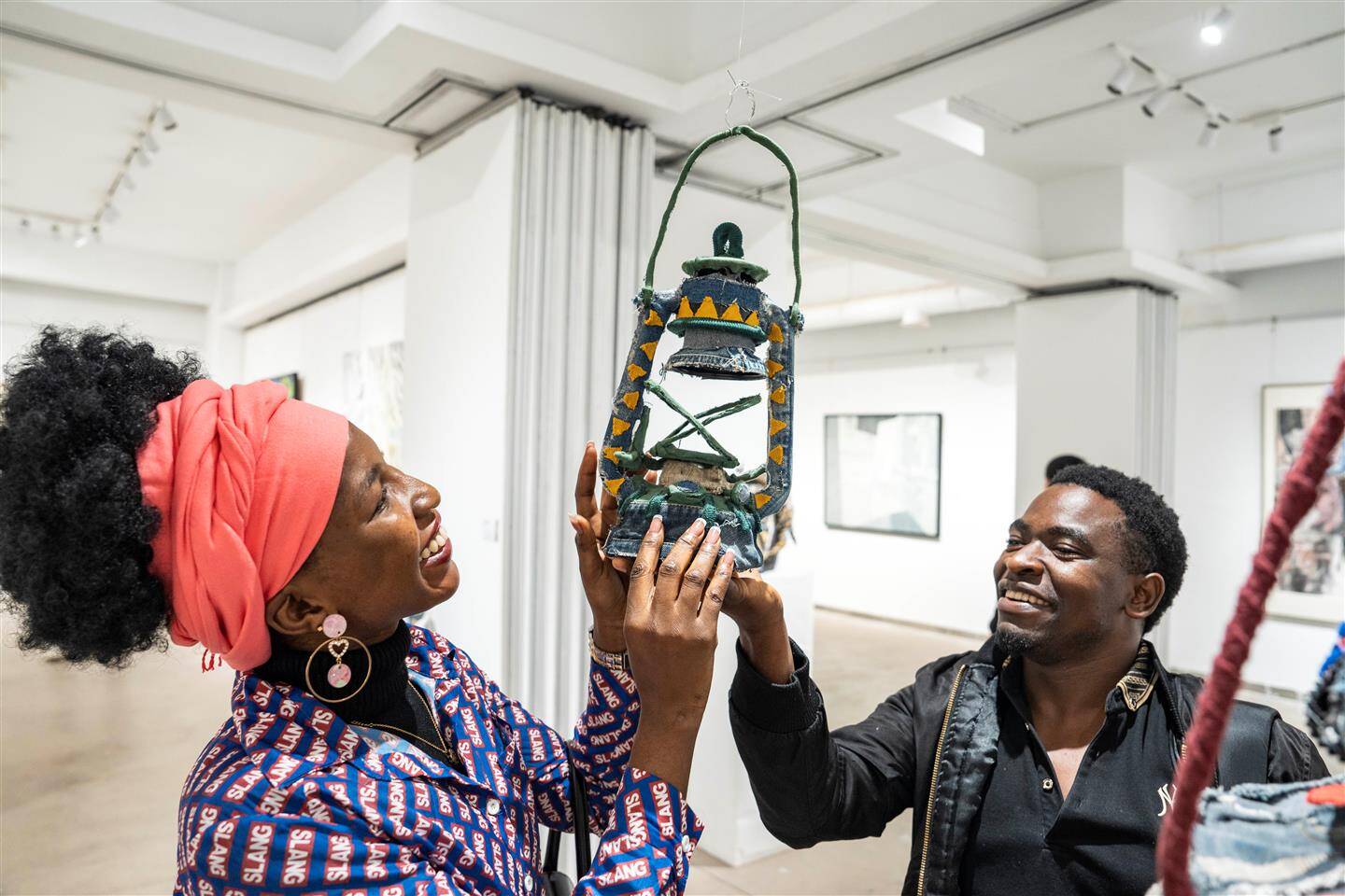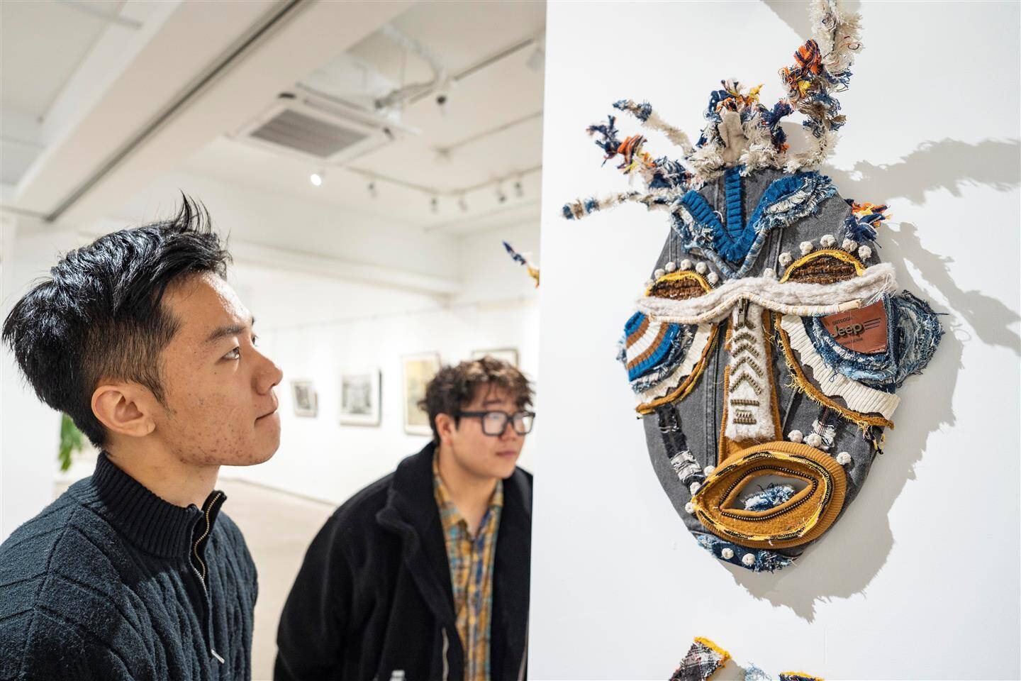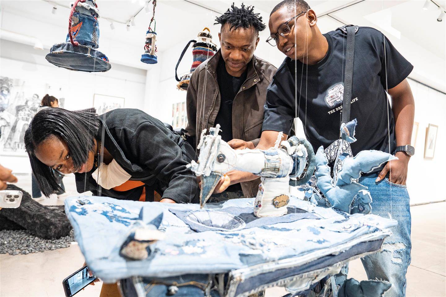 展厅入口处,一台由彩色牛仔布精心装饰的缝纫机引人注目。这是由浙江师范大学创意与设计学院研究生楚逸飞和沈婷婷创作的作品《共织》。楚逸飞介绍,其灵感源于象征中非友谊的坦赞铁路,缝纫机是当时中方援建人员的生活用具之一,是中坦工人协作、中非友谊的象征载体。“作品布料采集自数十位非洲留学生的旧衣,配色与装饰则汲取自非洲鸟类意象,寓意着中非文化与情感在针脚‘共织’中紧密交融,历久弥新。”