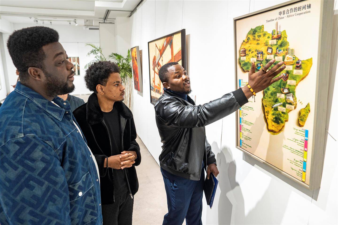 来自刚果(金)的留学生金瑞,已在中国生活学习了八年。此次他展出的数字艺术作品《时间轴》以非洲地图为基底,清晰标注了中非合作的标志性项目及时间节点,旨在展现中非友好合作的历史脉络与丰硕成果,传递出携手共进、命运与共的积极信号。金瑞说,希望以艺术作品为桥梁,增进中非人民之间的了解和友谊。