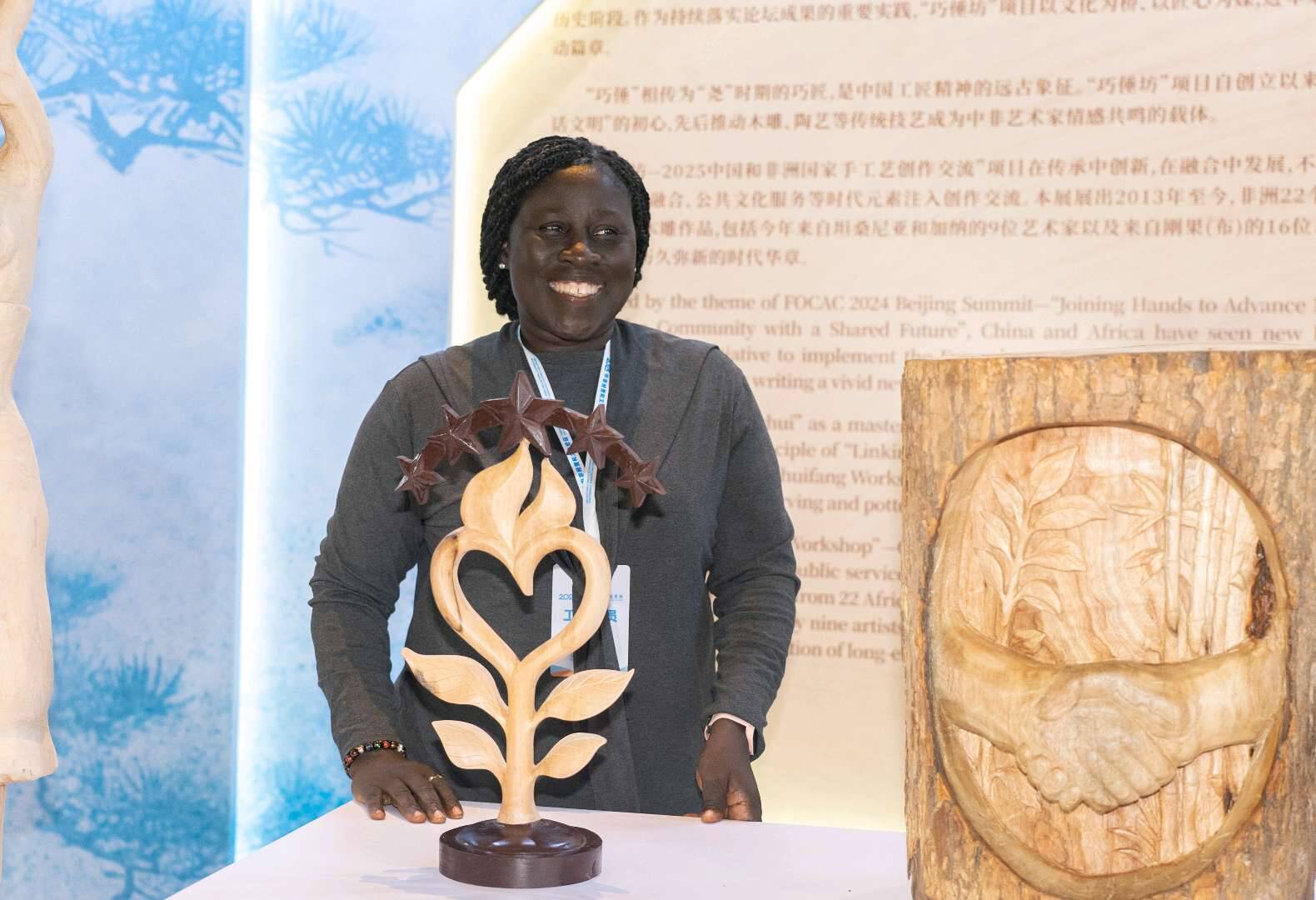加纳木雕艺术家艾琳·奥乌苏·阿坎庞·安庞创作的作品名叫《中非友谊之火》,这件木雕作品整体造型极具震撼力。她用细腻的雕琢展现出火焰的旺盛生命力,寓意着中非友谊如这火焰一般,永远不会熄灭,火焰上还有五颗星星。她说,五颗星星象征着中国的五星红旗,希望通过这件作品来表达中非友谊地久天长。