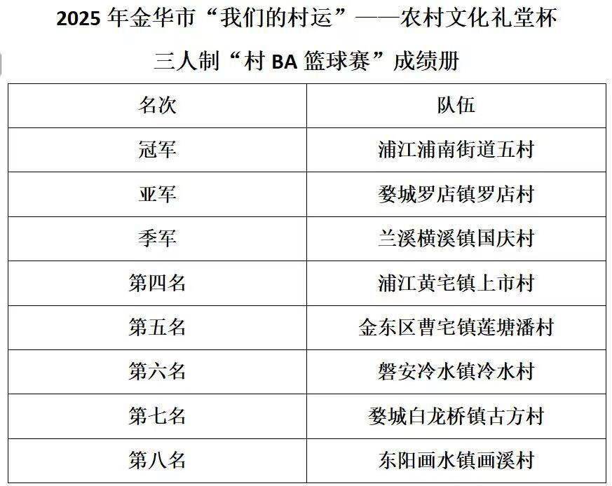 【10:52】恭喜兰溪横溪镇国庆村以5分优势击败浦江黄宅镇上市村,成功收获季军。