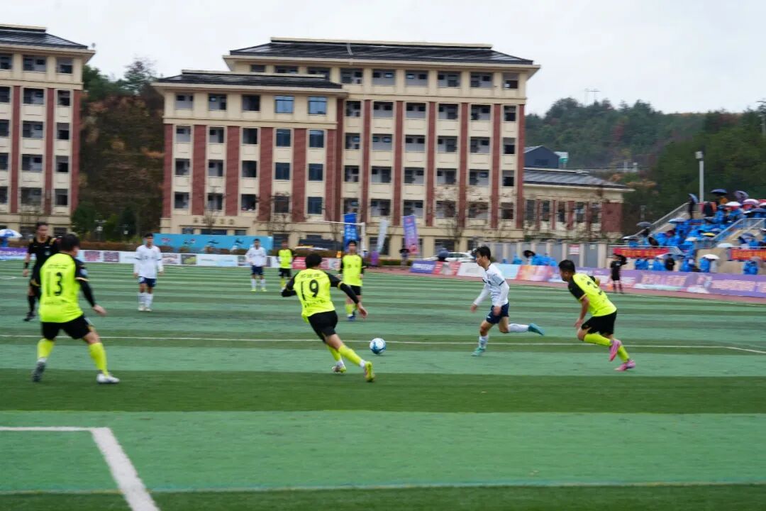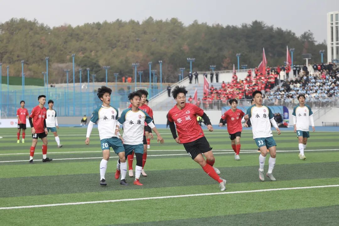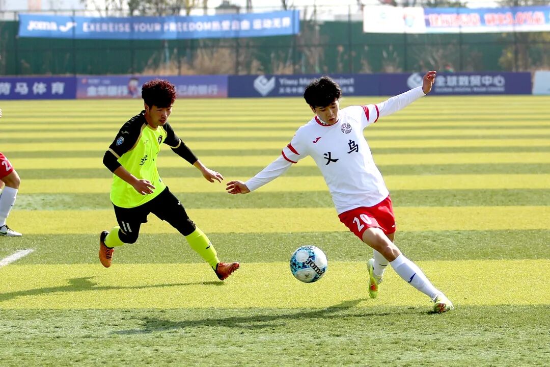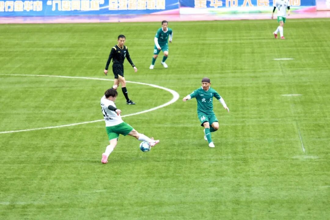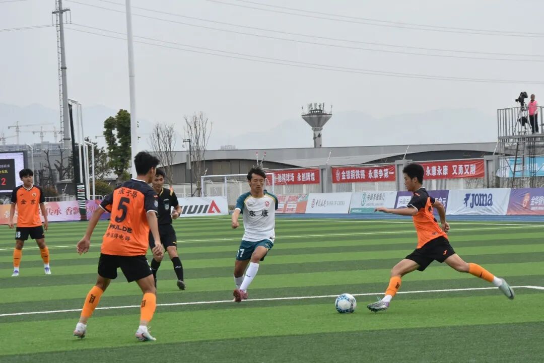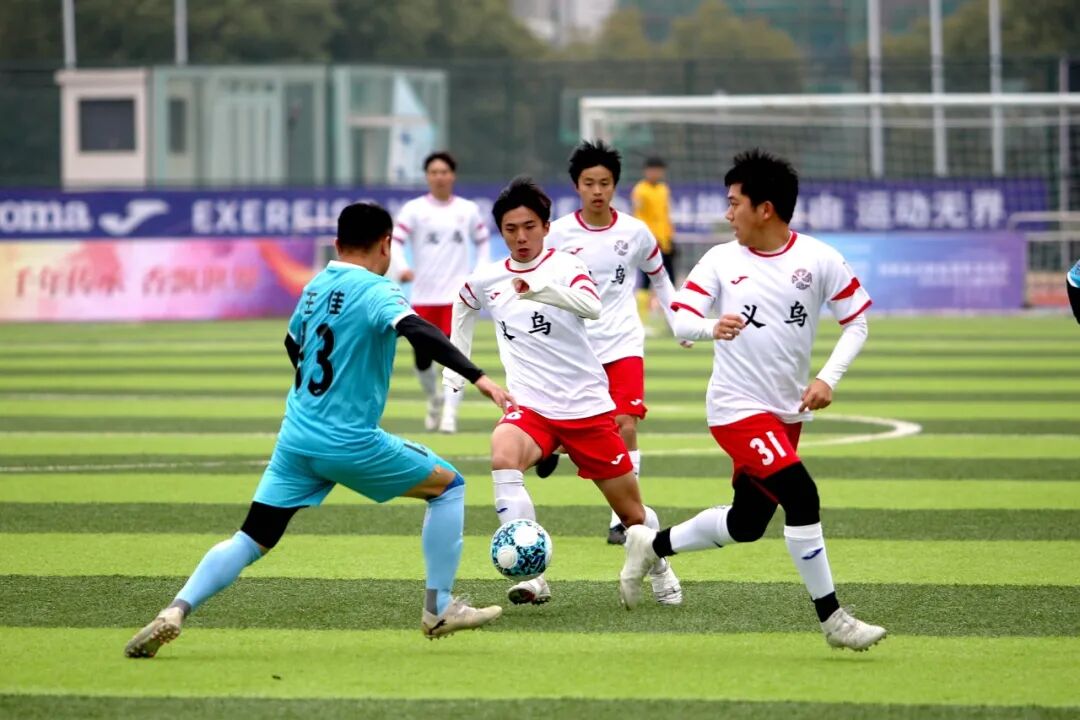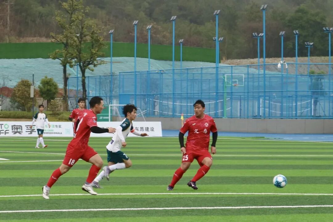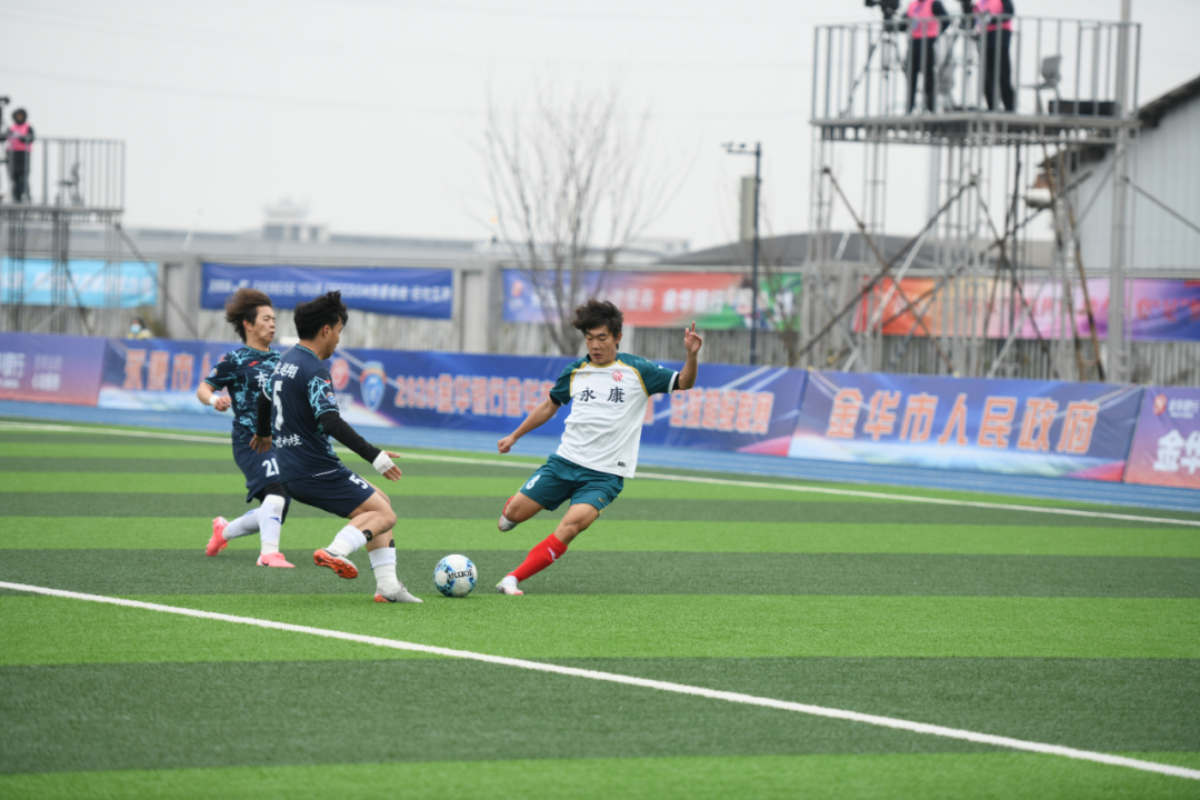永康队与义乌队的强强对话开场即掀起波澜。第3分钟,义乌队33号杨浩哲接角球传中,高高跃起头槌破门,为球队取得一分。此后,多名主力缺阵的永康队收缩防线,以顽强的防守与对手周旋,双方在中场展开激烈缠斗。易边再战,雨势不减,湿滑的场地让比赛愈发胶着。第82分钟,义乌队凭借默契配合,由36号徐铭皓接队友助攻再下一城,将比分扩大为2:0。最终,义乌队客场带走胜利。