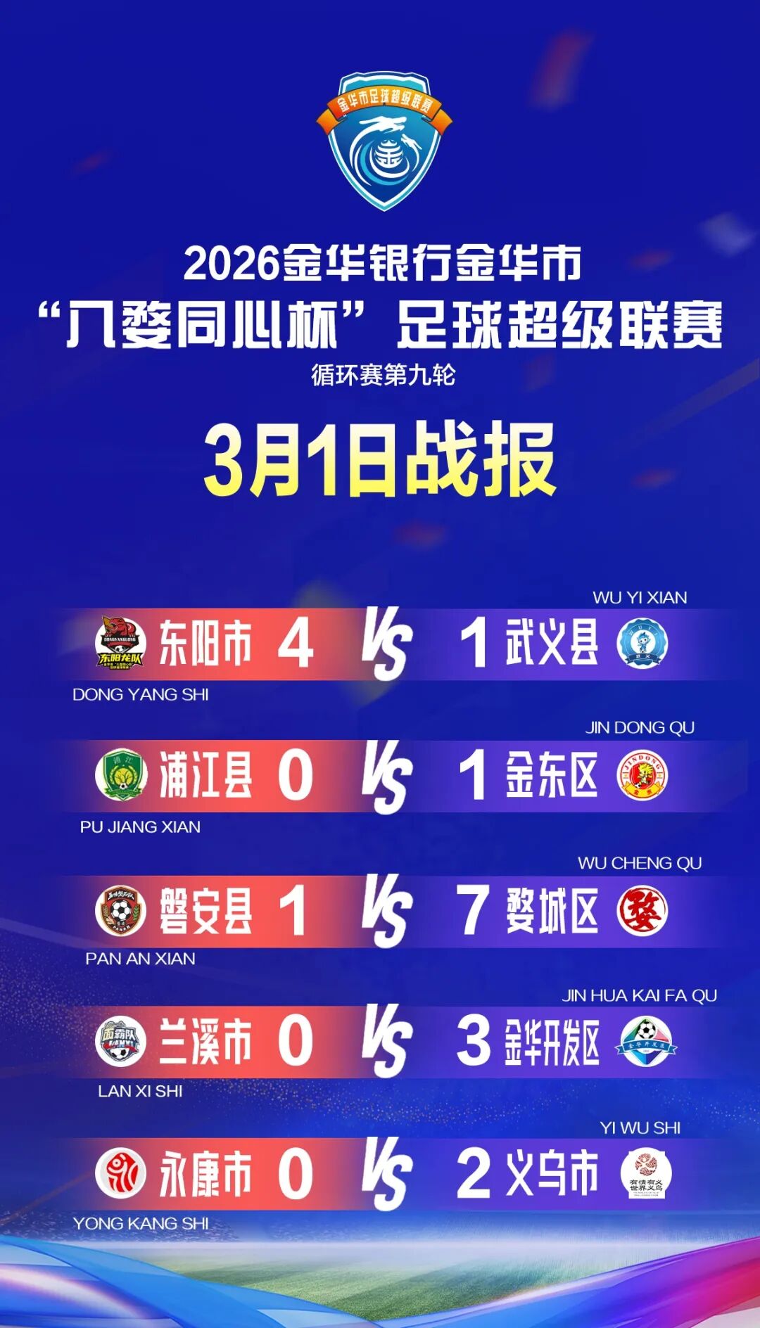 3月1日下午,2026金华银行金华市“八婺同心杯”足球超级联赛循环赛最后一轮在雨中落下帷幕。最终,金东、义乌、婺城、永康四支队伍凭借出色的发挥,成功跻身积分榜前四,顺利挺进淘汰赛。