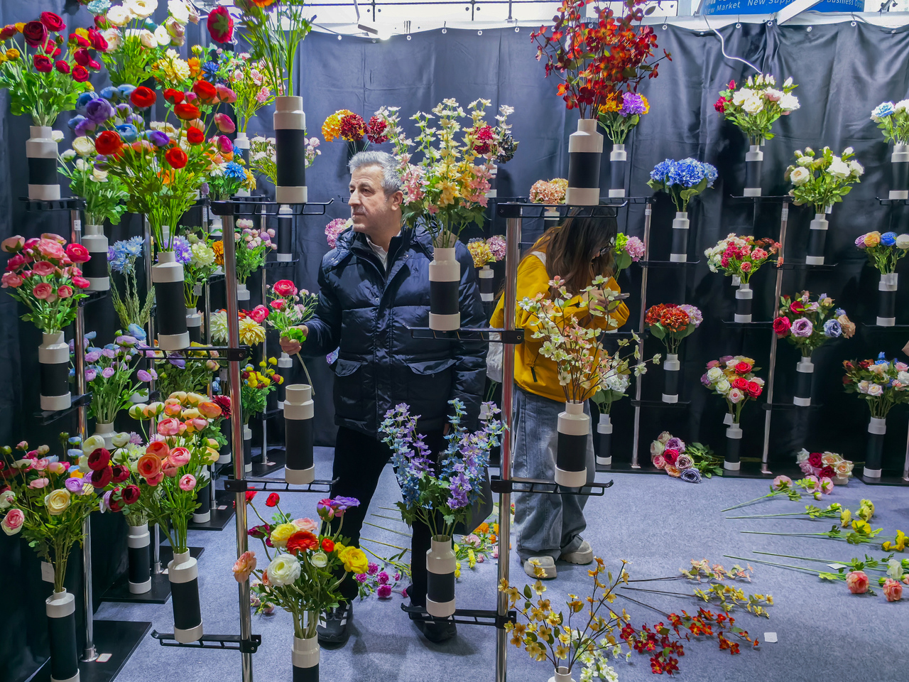外商在展会现场挑选仿真花产品。主办方供图
