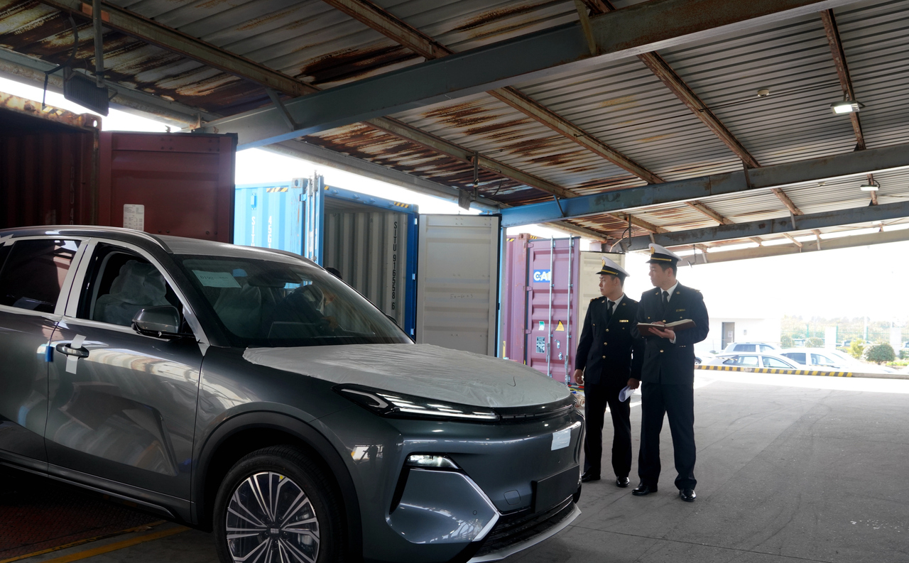 宁波海关关员对出口汽车进行现场监管。朱佳娜 摄