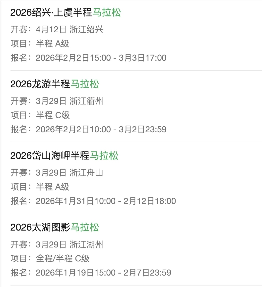 其中,武汉、无锡、丽水、奉化、成都都江堰、河南安阳等6个城市马拉松赛事包含全程、半程项目,其余12个马拉松比赛均为半程项目。